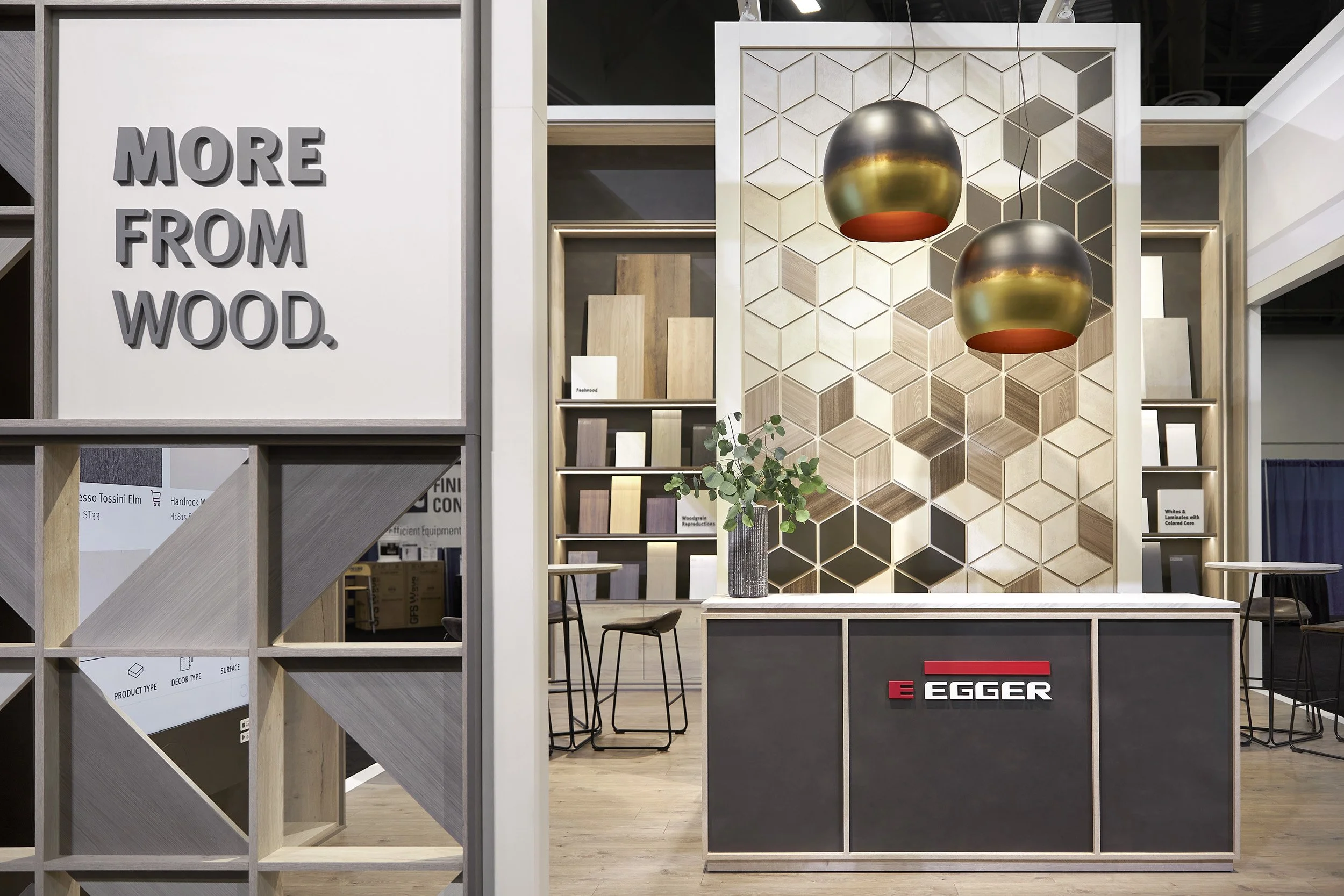 This custom 20' x 20' exhibit was designed and fabricated for the Association of Woodworking & Furnishings Suppliers® (AWFS®) show in Las Vegas. Constructed almost entirely out of Egger’s own wood products, the space showcased all their key offerings - high pressure laminates, particleboard, TFL (thermally fused laminate), and flooring.